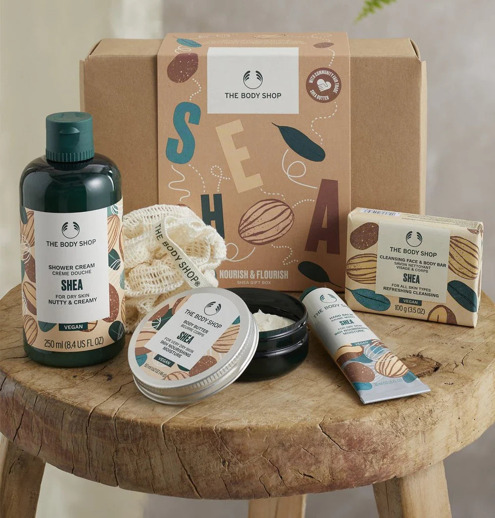 Exfolieer eerst de droge huid met onze Shea bodyscrub. Daarna voelt het zacht aan en is het klaar om veel vocht op te nemen als je het wast met onze zijdezachte Shea Douchecrème. Tenslotte – en hier komt de magie – breng ruimschoots van onze legendarische Shea Body Butter aan, onze beste vochtinbrengende crème voor de zeer droge huid. Het is verrijkt met Community Fair Trade sheanoten en voorziet je huid 96 uur lang van intensief vocht. Je badkamer zal hemels ruiken, geloof ons.
