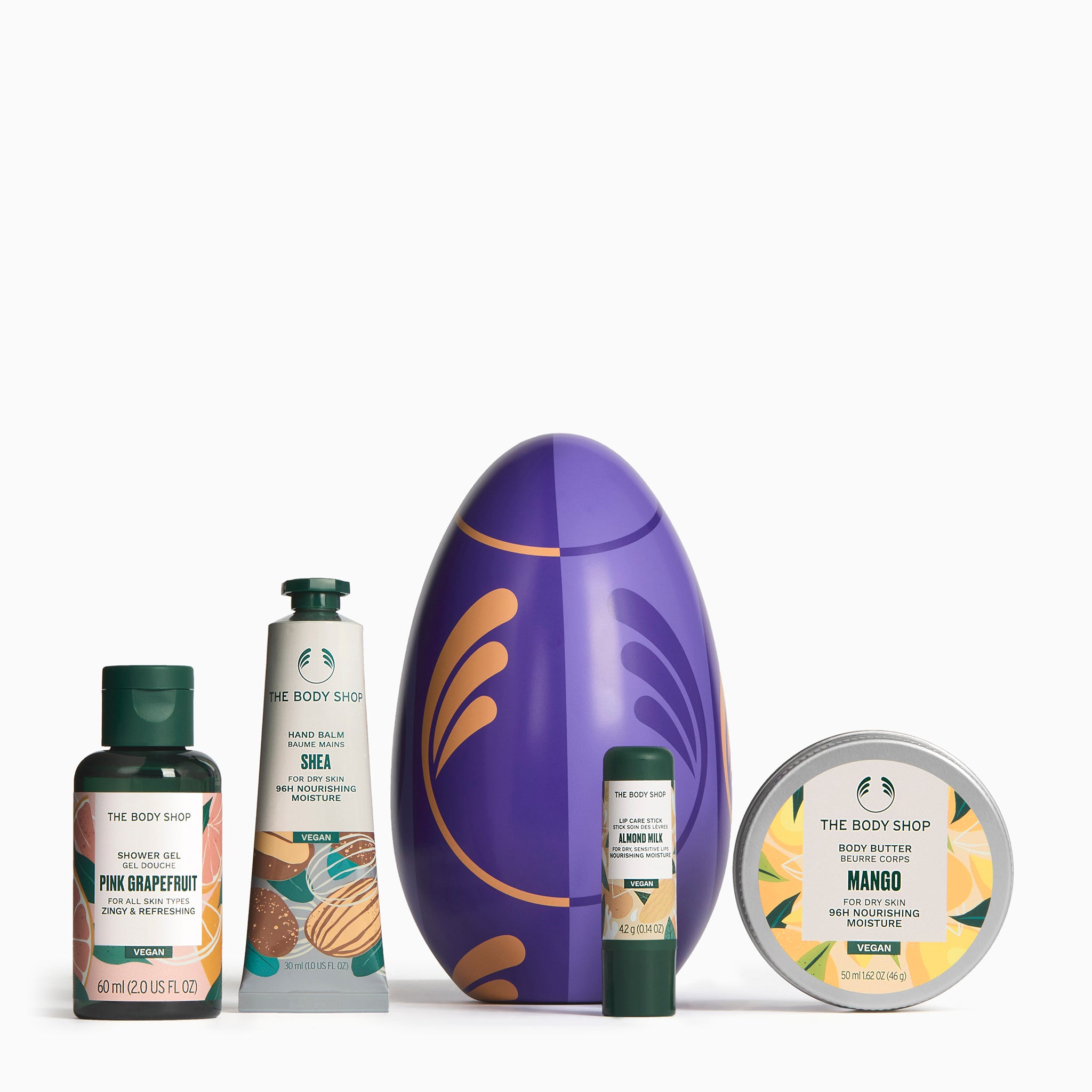 De collectie bevat onze Mango Body Butter, verrijkt met fairtrade sheaboter uit Ghana, om hun droge huid te verzorgen en te voeden als nooit tevoren. Daarnaast bevat de set onze verfrissende, schuimende Pink Grapefruit Shower Gel, zodat ze zich stralend schoon voelen, onze intensief verzorgende Shea Hand Balm om hun handen te beschermen en onze kalmerende Almond Milk Lip Balm, die in één keer hydrateert – voor een echte paasverwennerij.