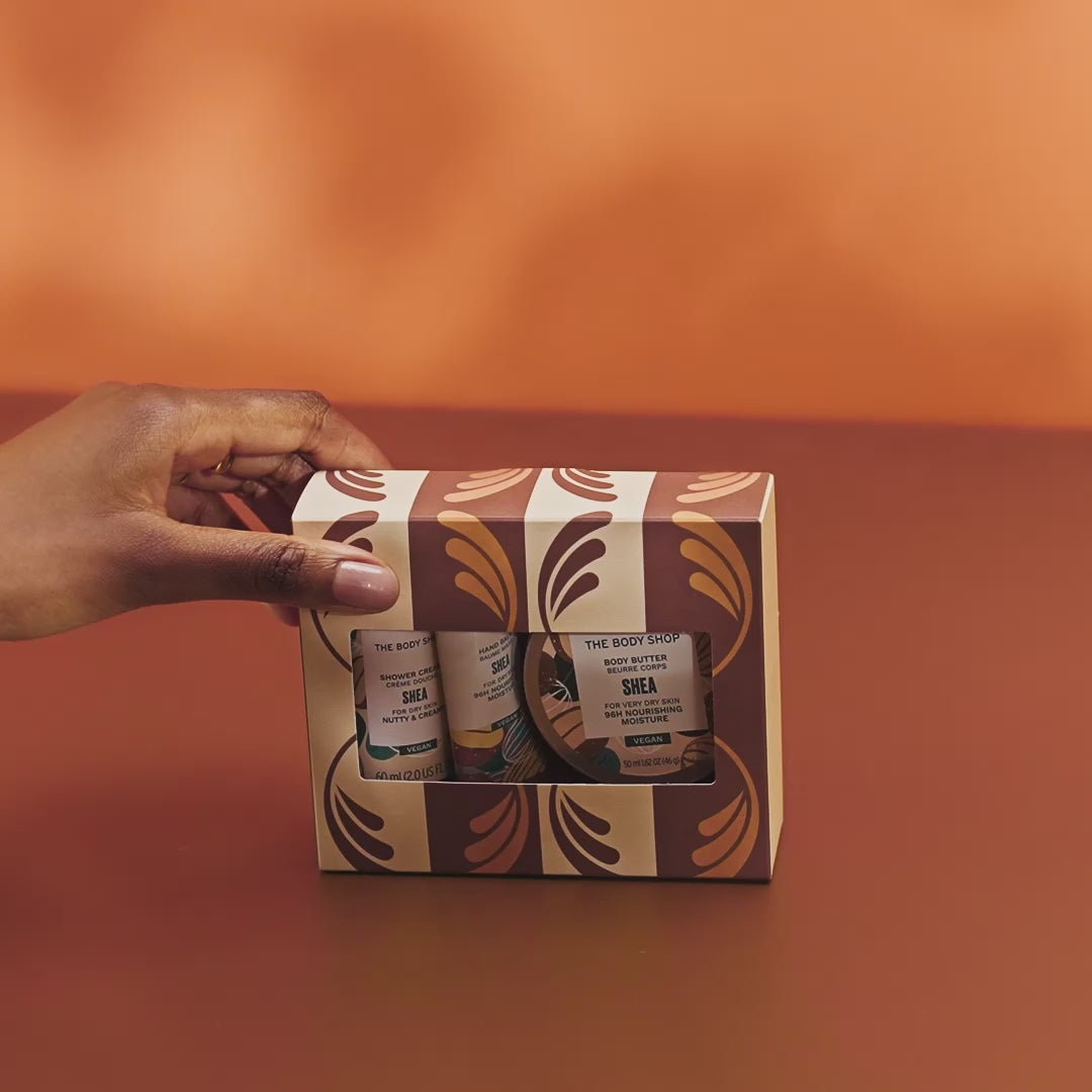 Dit intensief verzorgende trio bevat onze populaire Shea Body Butter, verrijkt met met de hand bereide Community Fair Trade-sheaboter uit Ghana, die droge huid heerlijk zacht en soepel houdt. Verder bevat hij een schuimende, milde, hydraterende Shea Shower Cream en een tubetje Shea Hand Balm, voor zachte, beschermde handen. Allemaal met een subtiele, warme, notige geur.